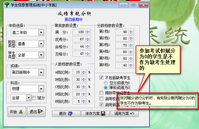 因系统在赋分时会自动区分由于未参加考试的0分还是因分值太低而导致赋0分,并且会在常规分析等相关模块中也保持一致。