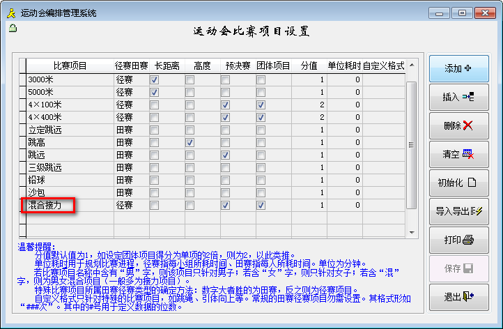 操作方法:仅要求在【录入数据】→【录入比赛项目】中录入混合团体项目时,项目名称中必须包含“混”字,系统据此确定这是混合项目,剩下的事就由系统来完成了。