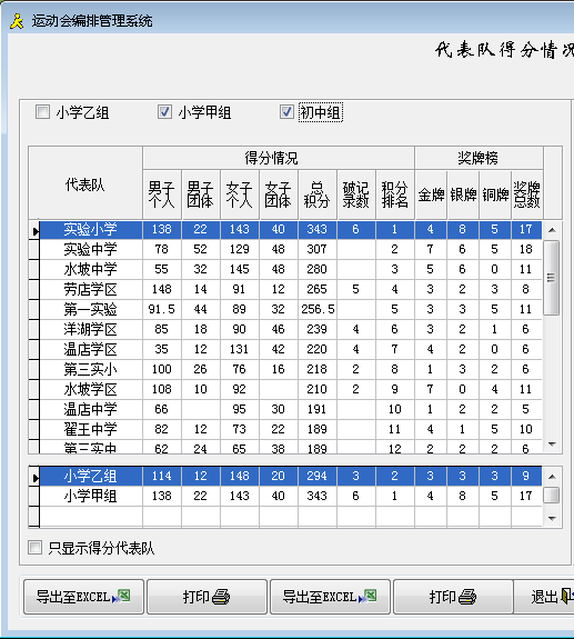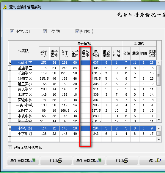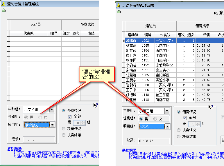 同时系统会自动判断当前比赛项目中有无混合项目,并显示不同的界面。