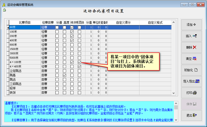 1、只要在【录入比赛项目】模块中将某一项目中的“团体项目”勾打上,系统就认定该项目为团体项目。
