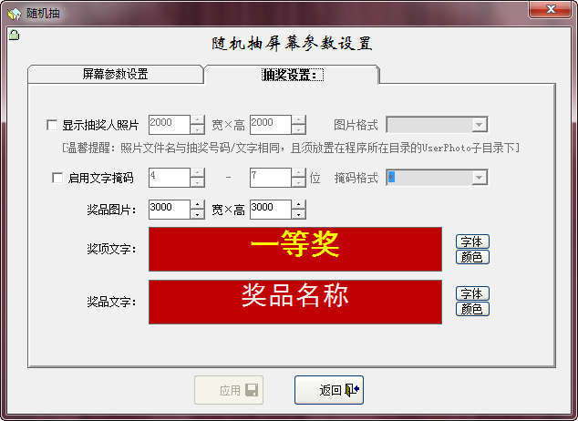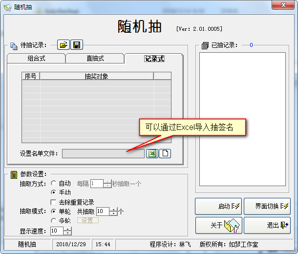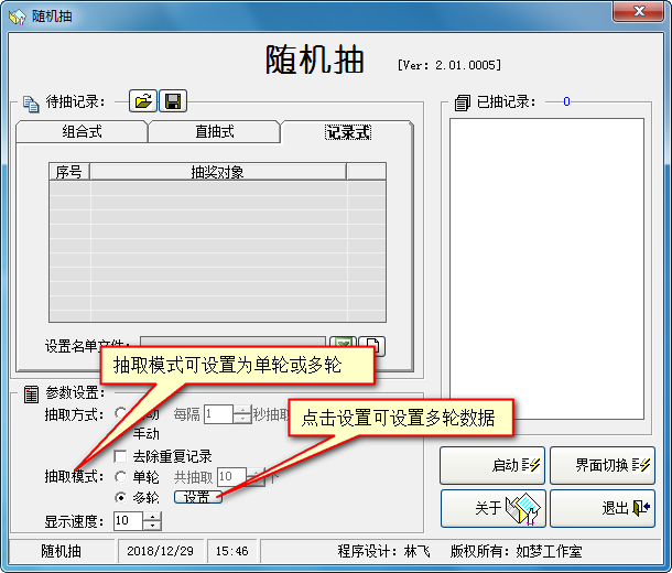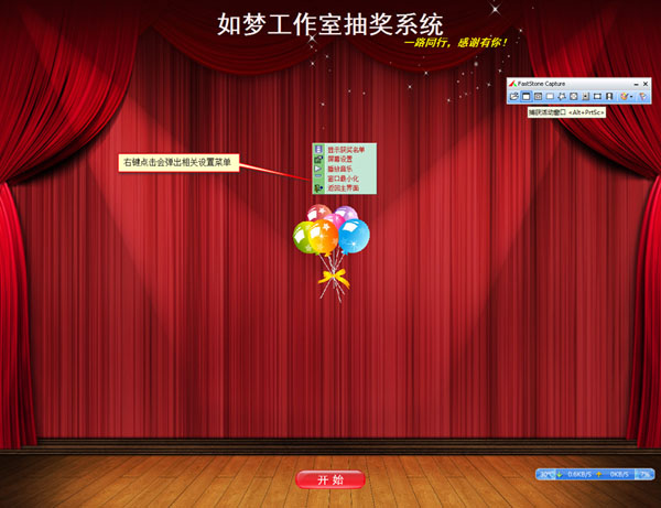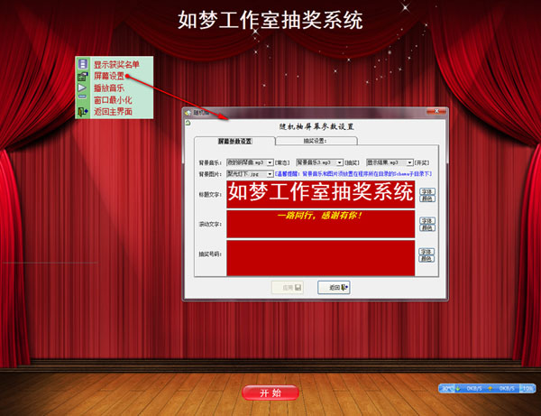 一、根据设定的方式产生抽奖名单:二、设置抽奖模式三、如果是“多轮”模式,还需设置奖项参数。四、点击“界面切换”按钮切换至抽奖界面。五、在界面右键单击会弹出选择菜单,可设置各项参数六、设置显示获奖名单七、设置屏幕各元素八、开始抽奖