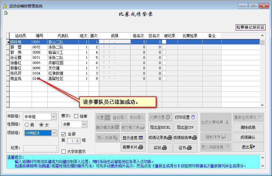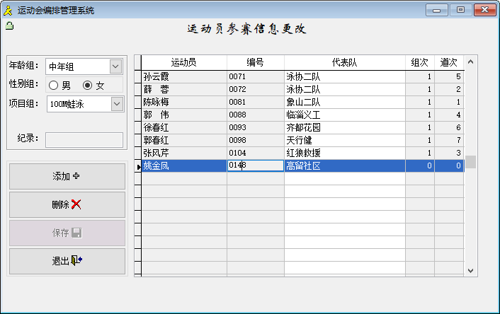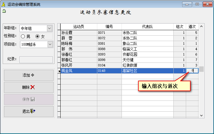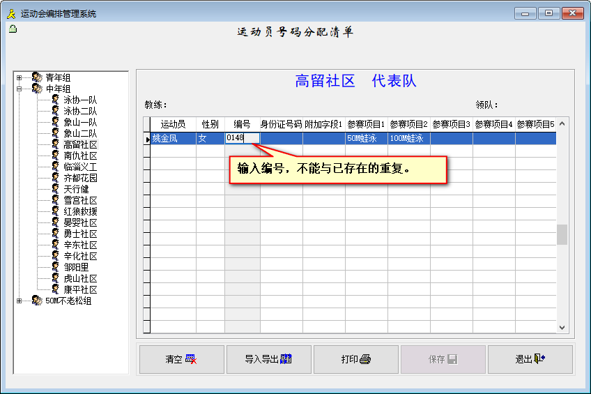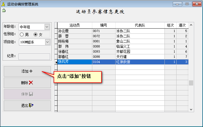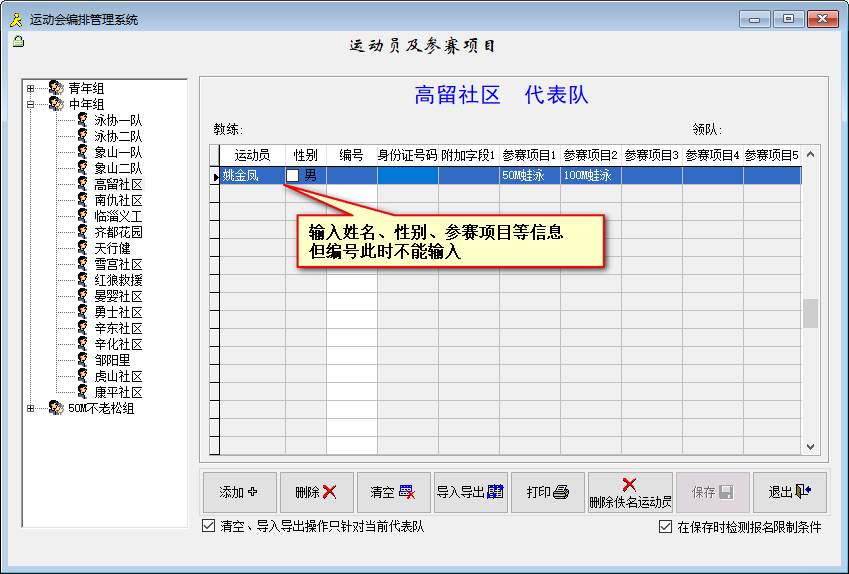 第一步:进入“录入运动员”模块,在相应的年龄组与代表队下输入运动员相关信息(包括姓名、性别、参赛项目等,此时编号不能输入,需在下一步骤中输入。)