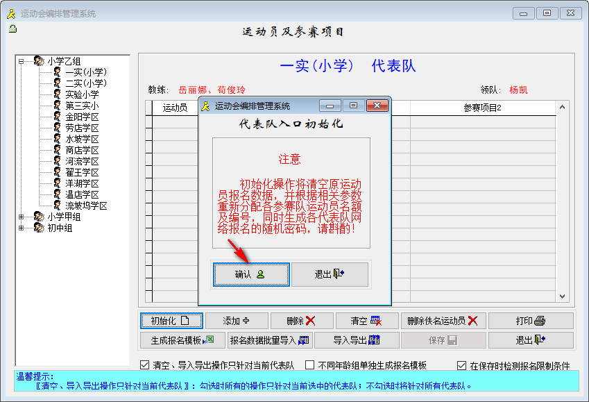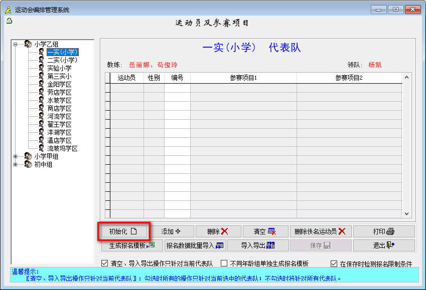 如果原报名数据存在,也可以不要初始化,通过运动员录入模块为各队添加相应增加名额的空白运动员。