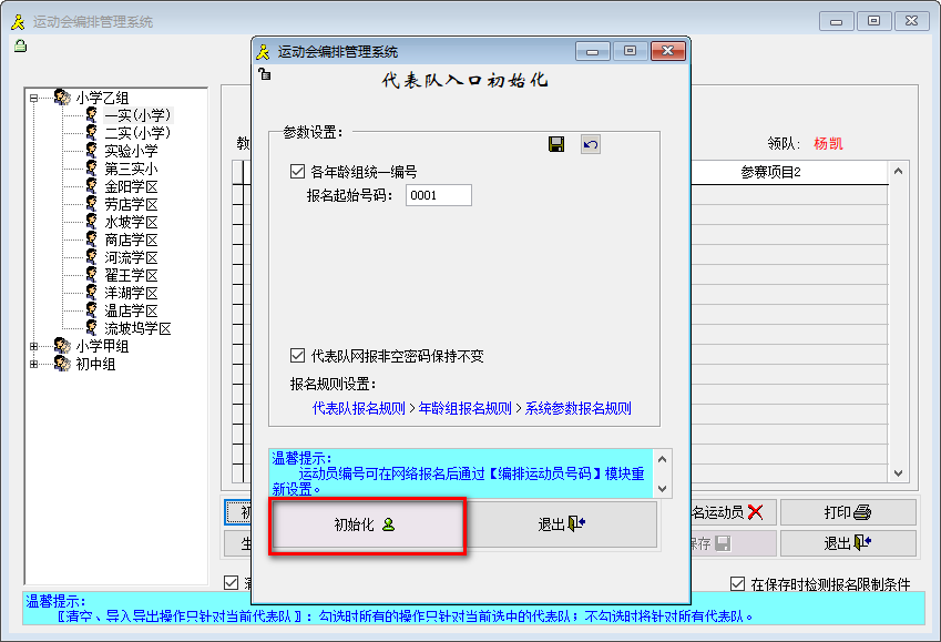 初始化的目的是根据报名规则为每一个代表队分配一定数量的空白名额,然后通过客户端或网络报名的方式填写具体的运动员及参赛项目信息。