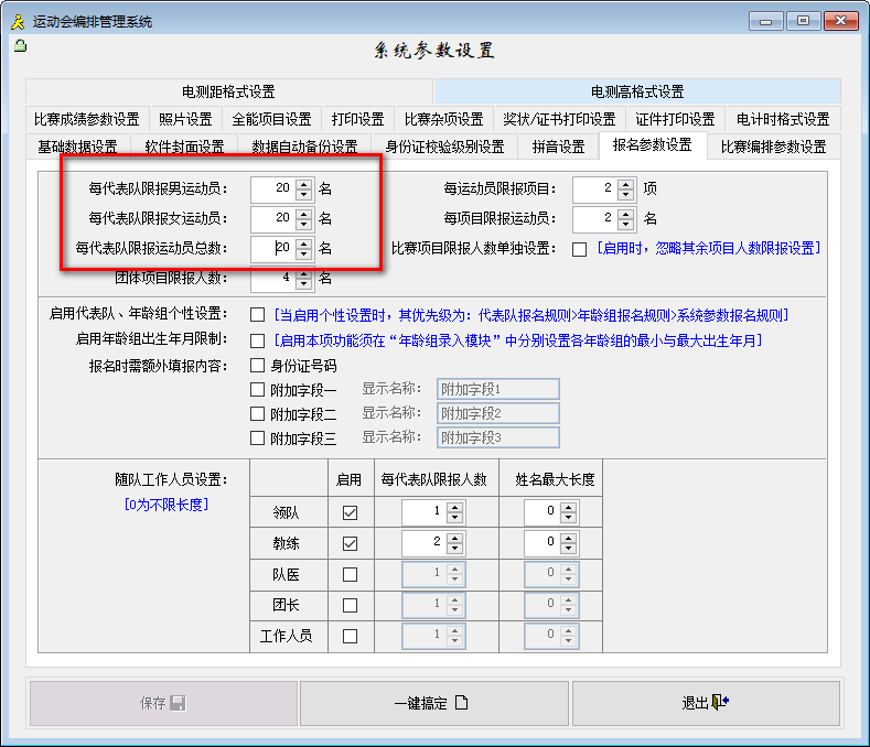 将总人数、男运动员人数、女运动员人数均设为总人数的限额即可。如总人数限报20人,但男、女分人数不限,可这样设置: