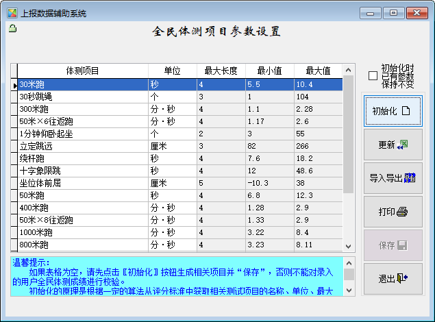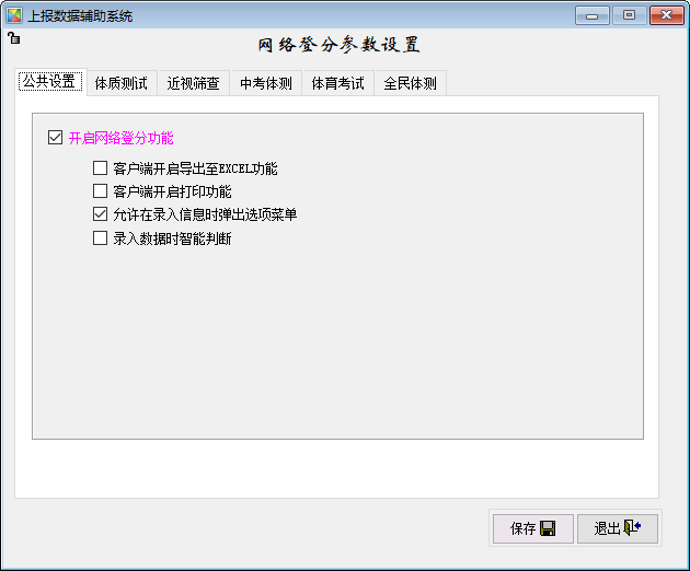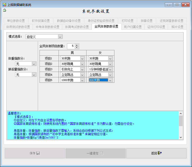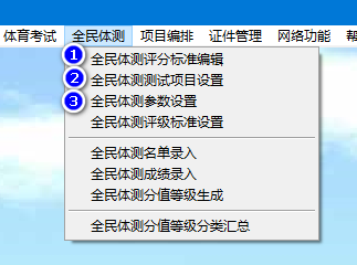 2、在“全民体测”模块中设置依次完成“评分标准”、“项目设置”、“参数设置”。