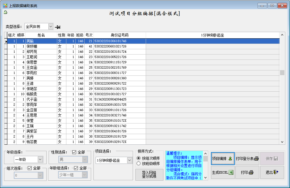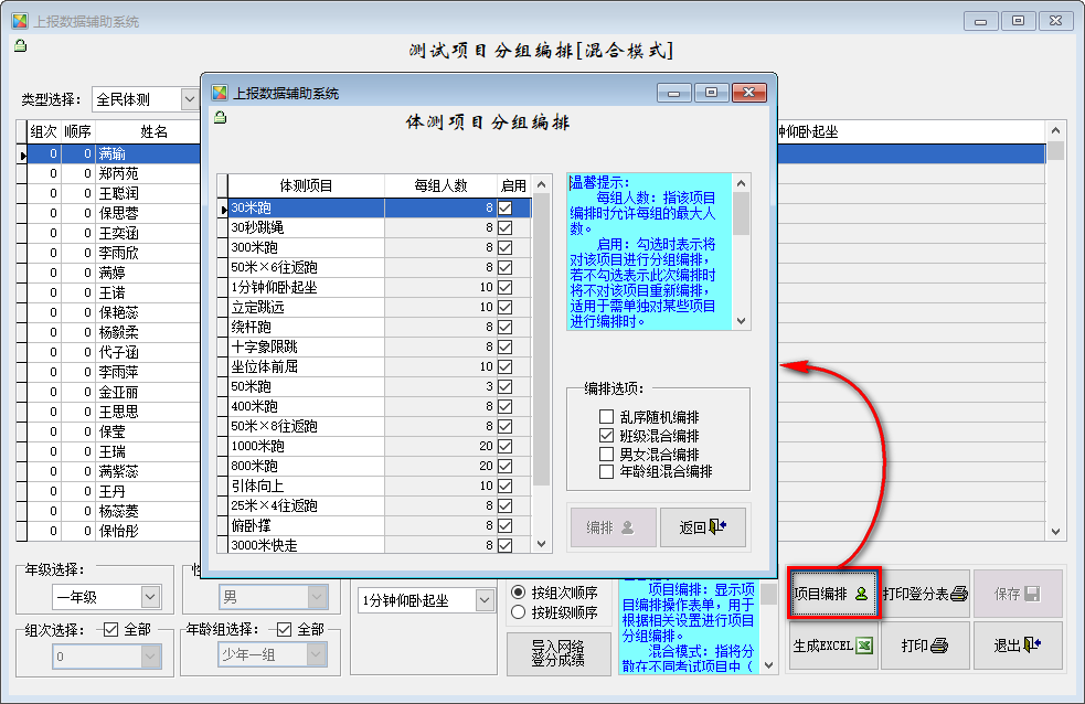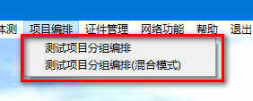 6、根据具体情况选择“测试项目分组编排”或“测试项目分组编排(混合模式)”进行比赛前编排。