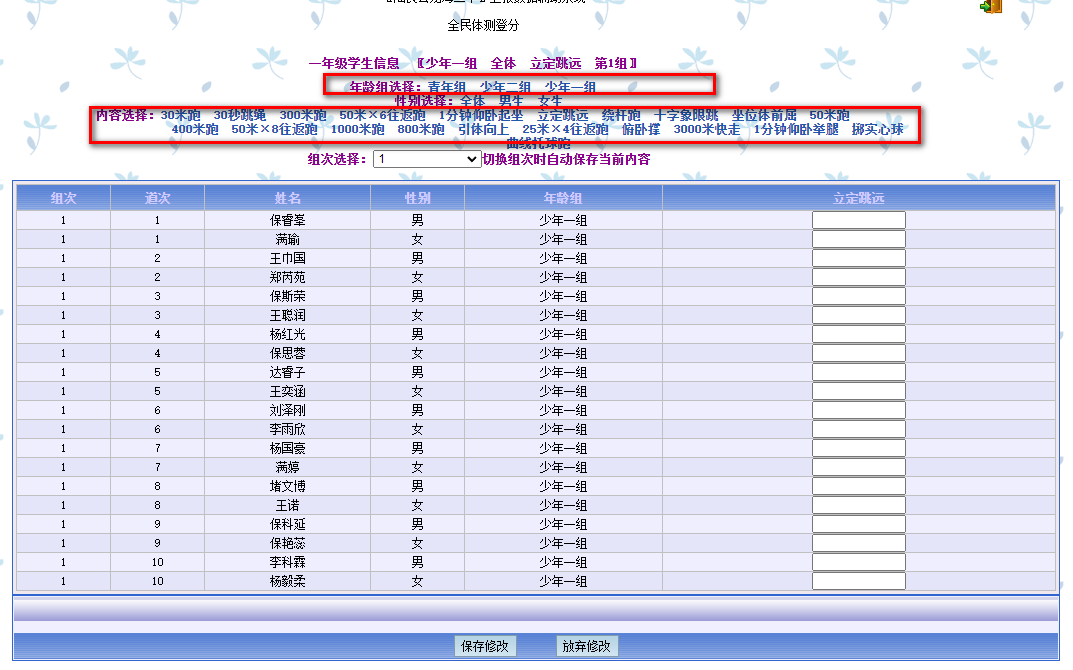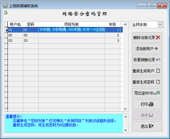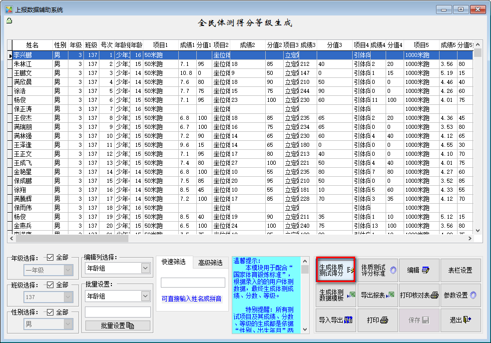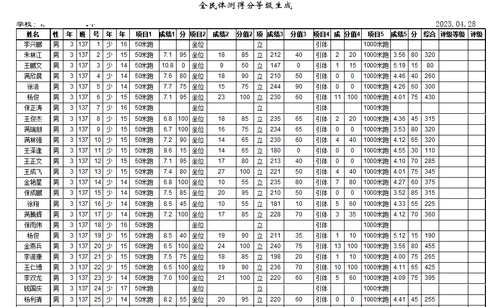9、“全民体测分值等级生成”模块生成各参赛人员的成绩。