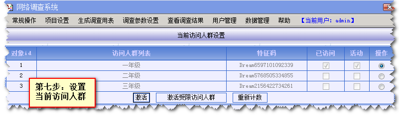 第一步:设置访问人员组别名称(用于根据组别进行分类统计,如无必要,可随便设置)第二步:设置访问人群(用于根据组别进行分类统计,如无必要,可随便设置)第三步:设置调查项目第四步:调查对象设置(可对不同的对象设置不同的调查项目)第五步:设置系统参数第六步:生成调查用表第七步:设置当前访问人群第八步:在首页中开启服务此时就可开始进行在线调查