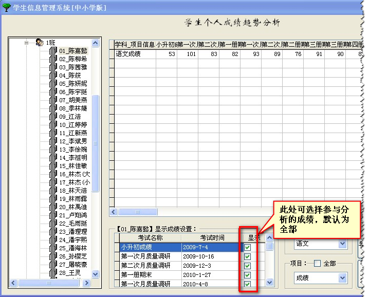 2、选择需要参与分析的列次考试项目,默认为全部3、点击“图表显示”4、双击图表区可改变图表类型等一系列相关数据方法二:网络查询