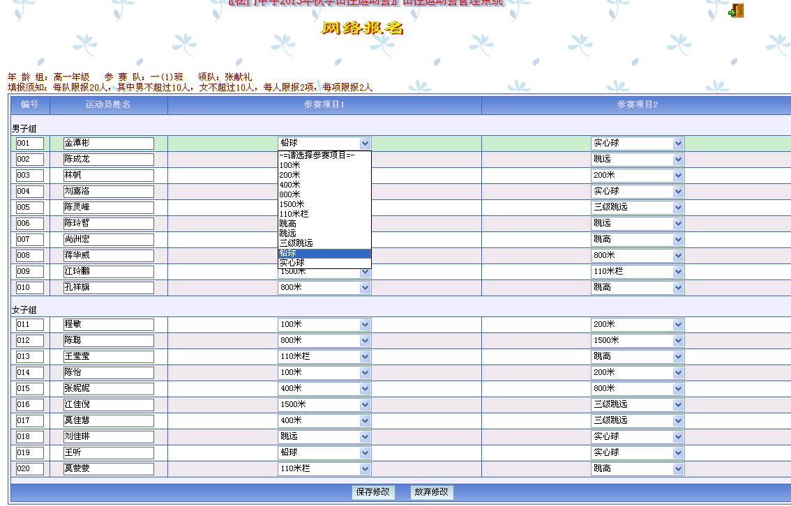 在代表队报名之前,先完成“录入比赛项目”、“录入年龄组”、“录入代表队及领队”,再进行“运动员录入”。报名方法有三:方法一:在系统中一个个录入(不提倡)方法二:通过EXCEL导入方法三:通过网络自行录入(需在“网络模块”中开启“网络报名”功能)