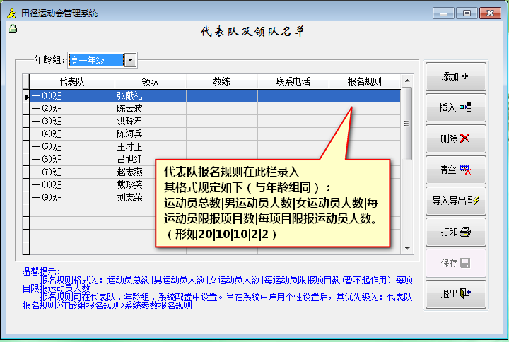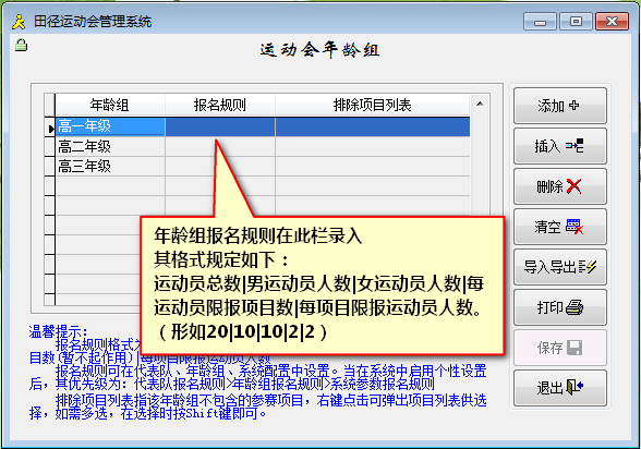 系统支持对不同的年龄组或不同的代表队设置不同的限制规则。详细设置方法如下图: