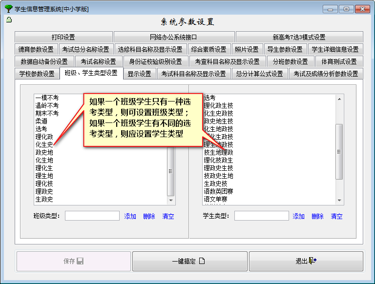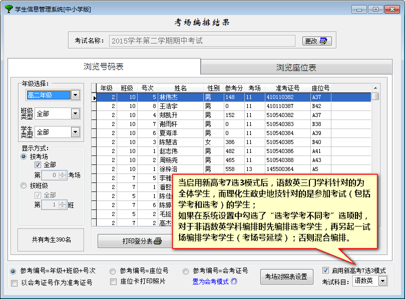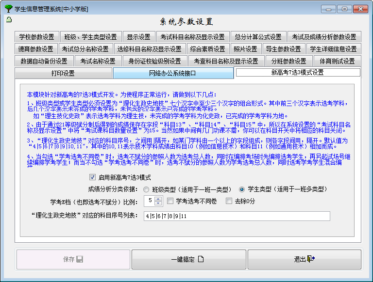 1、设置班级或学生类型2、系统设置(此处为关键设置)3、在试场编排、成绩登录、成绩分析中都有针对七选三的选项